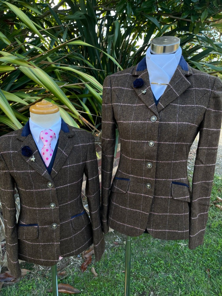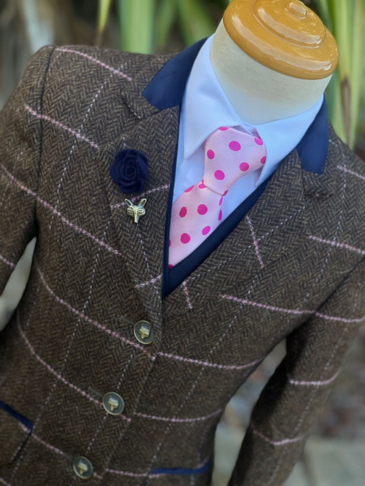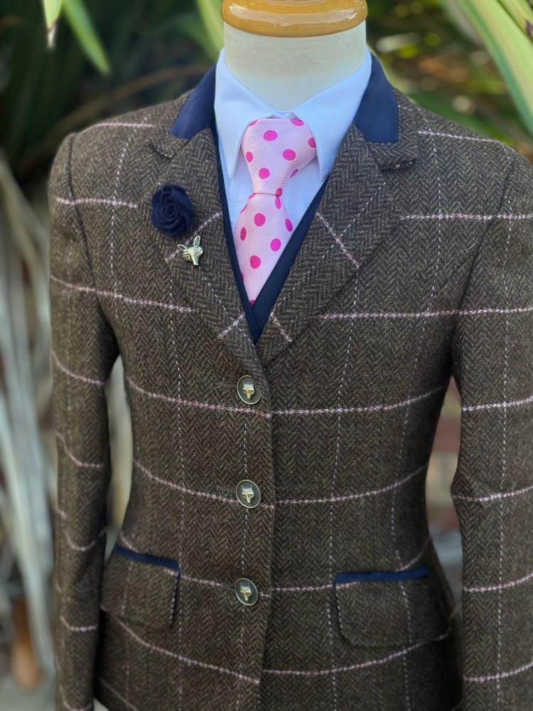 Make a statement with our simply stunning chocolate brown English tweed jacket! This medium-weight beauty features a playful pink overcheck that adds a pop of color to your ensemble.