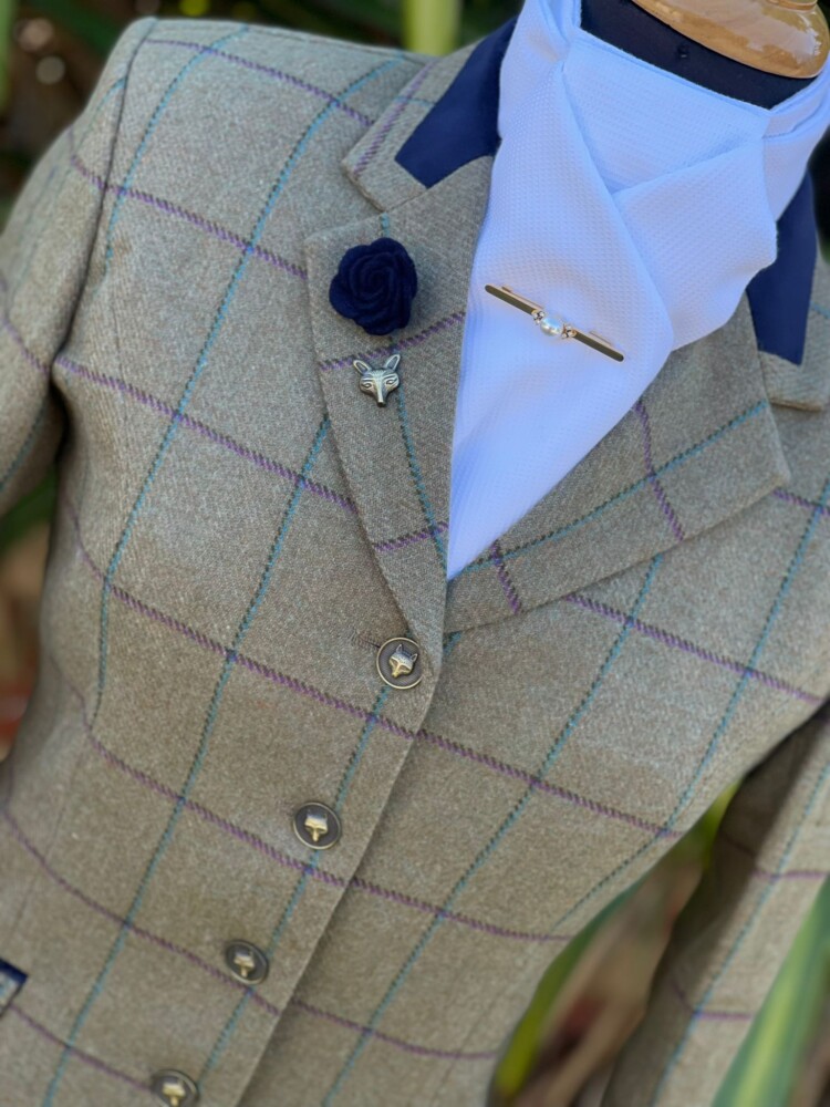 Gorgeous light green base with Aqua and purple check , Navy velvet trim and Bronze foxhead buttons
