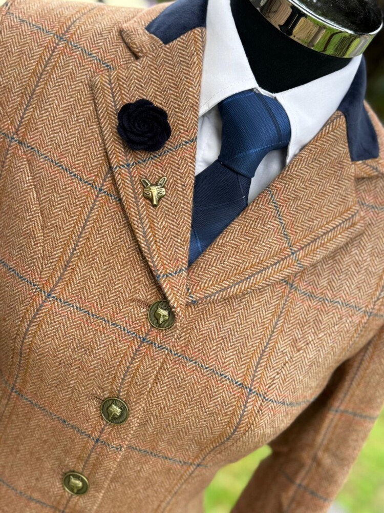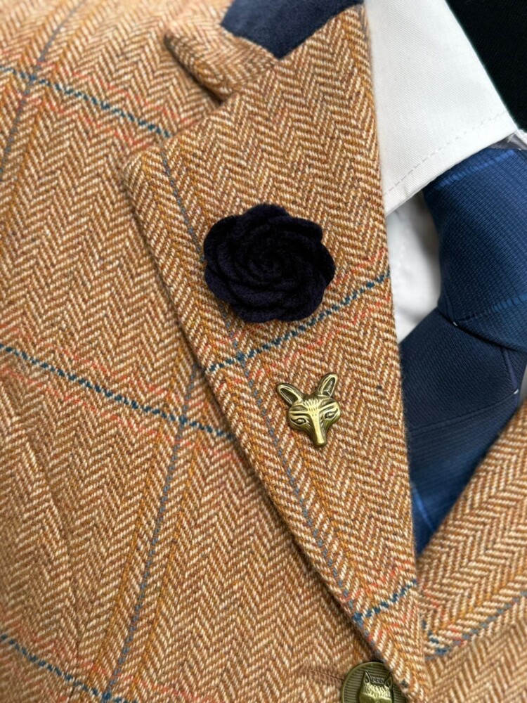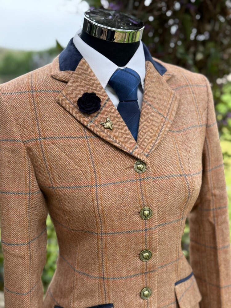 Gorgeous soft lightweight English tweed jacket with navy velvet trim, and bronze fox head buttons