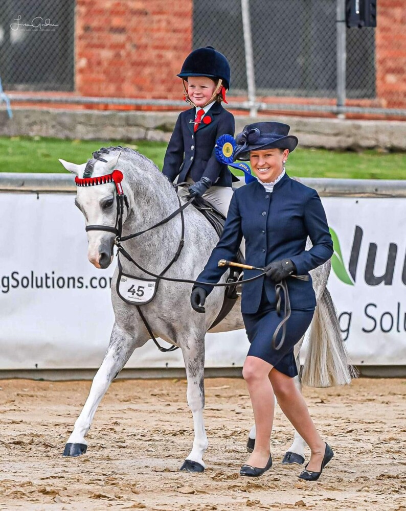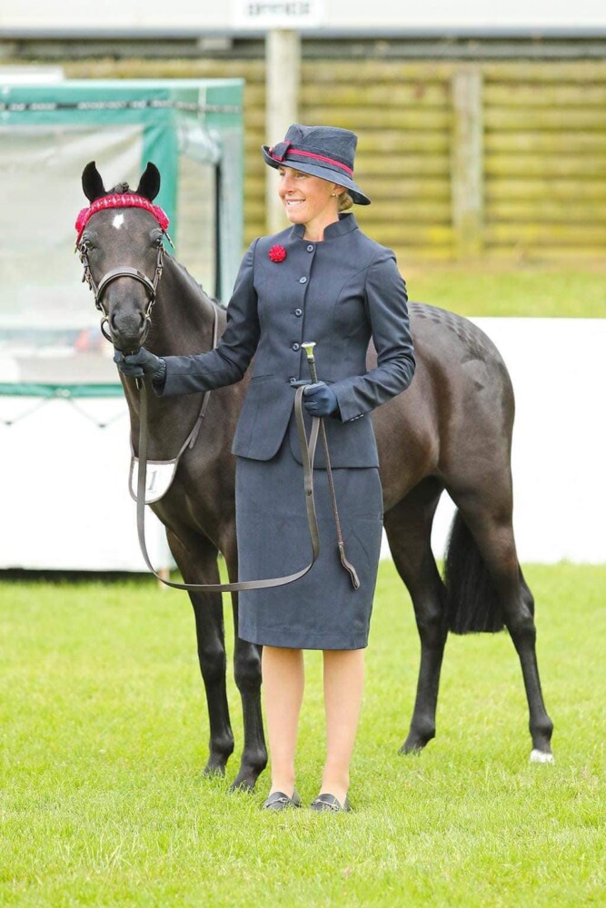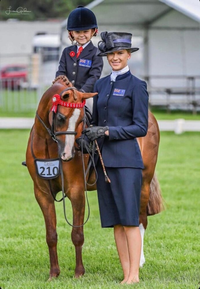 This set features a lovely high collar ladies jacket, adorned with navy buttons for a touch of elegance.