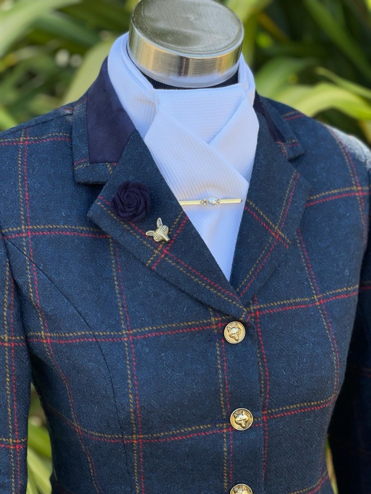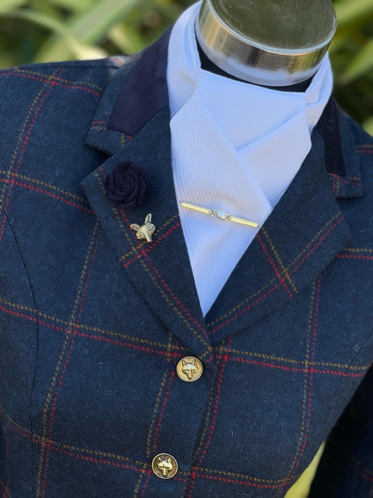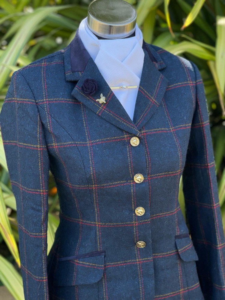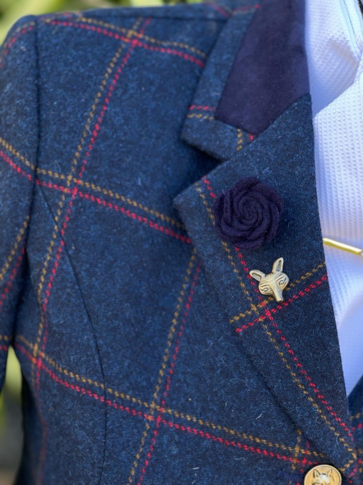 Introducing our stunning navy medium-weight English tweed jacket, accentuated with a striking red and mustard overcheck. Adorned with navy velvet trim and elegant gold foxhead buttons, this piece exudes timeless sophistication.
