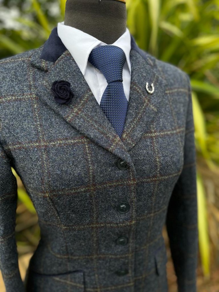 The navy velvet trim and navy foxhead buttons add a touch of elegance and sophistication that perfectly complement the rich blue tones.