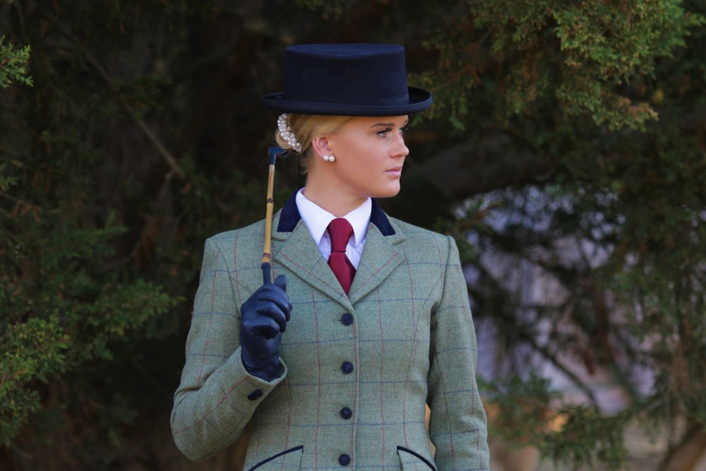 crafted in traditional English tweed. Earthy green tones are balanced by cool blue contrasts, enhanced with navy velvet trim and distinctive navy fox-head buttons. Timeless and tailored, also available in Child’s’ sizes to create a beautifully coordinated lead-rein outfit.