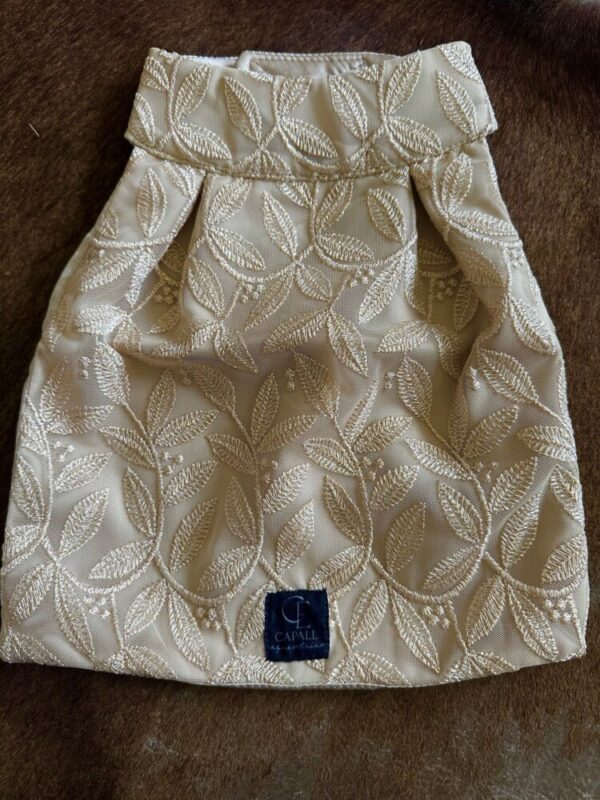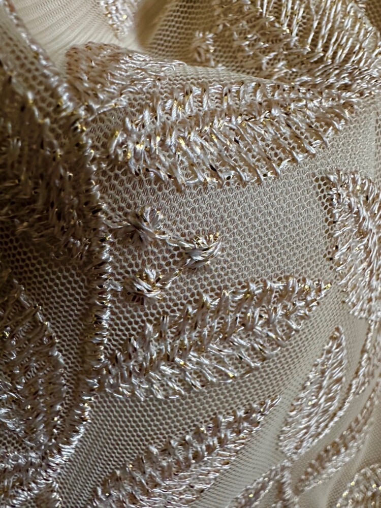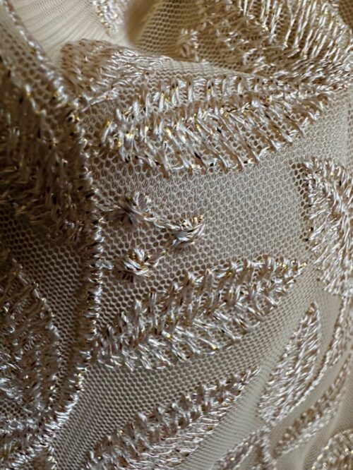 The Carmen Sparkles with gentle gold thread on pale gold satin .